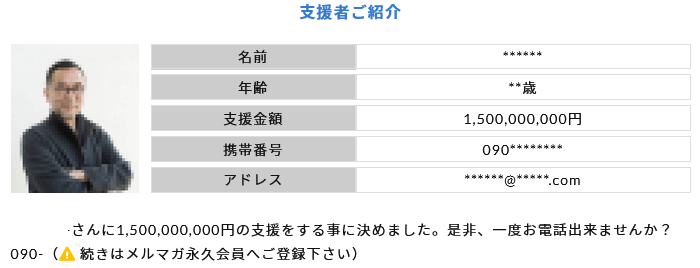 2006年:初の講演会実施 2010年:初メディア取材 2015年:メルマガ購読者100万人突破 2020年:支援総額100億円突破 【補足③】 (詐欺宣伝3)喜びの声