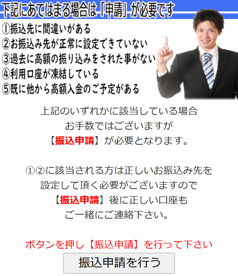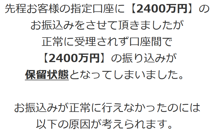 ご指定口座へ当選金2400万円のお振込みをさせて頂きました。大変高額のお振込み金額となるため、不正取引と判断され2400万円のお振込みが却下されました。 お客様の口座契約の規約の中に高額振込の解除がされていなかった為ご指定口座に反映されずにいます。 反映の為には【入金要請】を行う必要がございます。 |