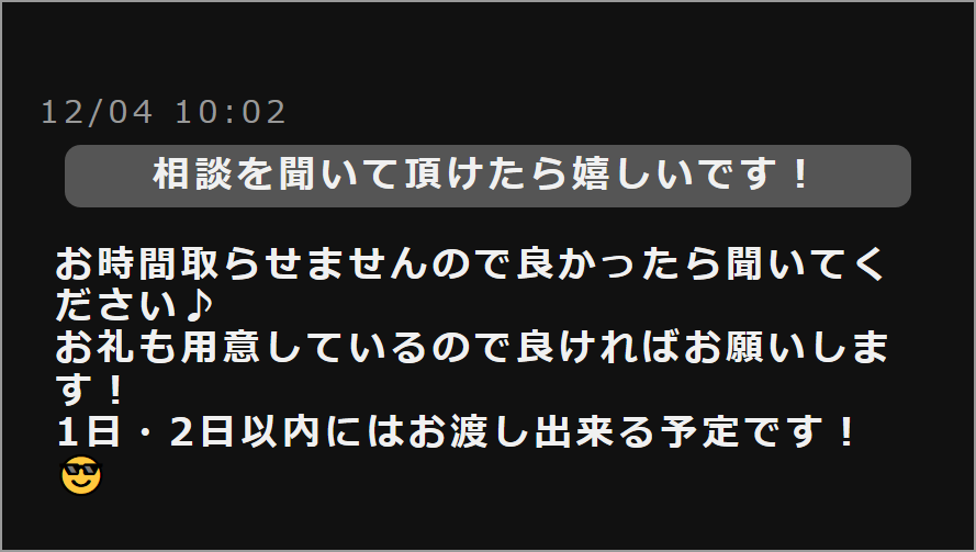 |   「相談を聞いてほしい、そのお礼も用意している」からという内容のメールが、すぐに届きます。 返信すると... ※よくある副業詐欺です!「相談聞いてくれたら○○万円渡す」とこの手口に騙されている女性が非常に多いです! |