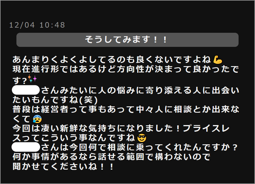 |   元カノの話をなが~い事話してますが、長すぎて気持ち悪いのでカットしましたが内容は 「元カノと結婚式前夜に元カノがパーティーでハメを外し複数の男性と裸で寝てた。自分は足の悪い母の介護をしてた。別れたけど最近になってやり直したいといわれ困惑している」 という最近のドラマでもないような悲劇のヒーローっぷりです。 しかもこの長文に返信で送ってきたのが2分かからずです。 完全にコピペです。。。 どうでもイイ相談ラリーが4~7回続きます! ※完全にサクラです!「可哀そう・家族思い・経営者・イケメン」という設定です!この後は絶対に甘えた言葉なども言ってきます! |