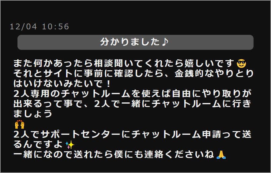 |   ↑の返信内容の事には一切触れずにきましたね~! サイトでは金銭のやり取り禁止だから「チャットルームへ行きましょう」となりました! 指示された通りにサポートセンターへ申請って送ると... これもサイトが言い逃れるためと、この後に費用を要求する口実なだけなので要注意です! |