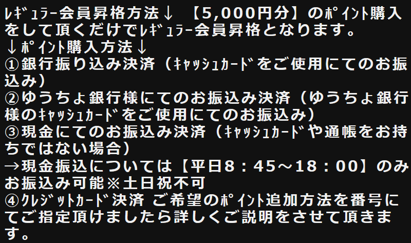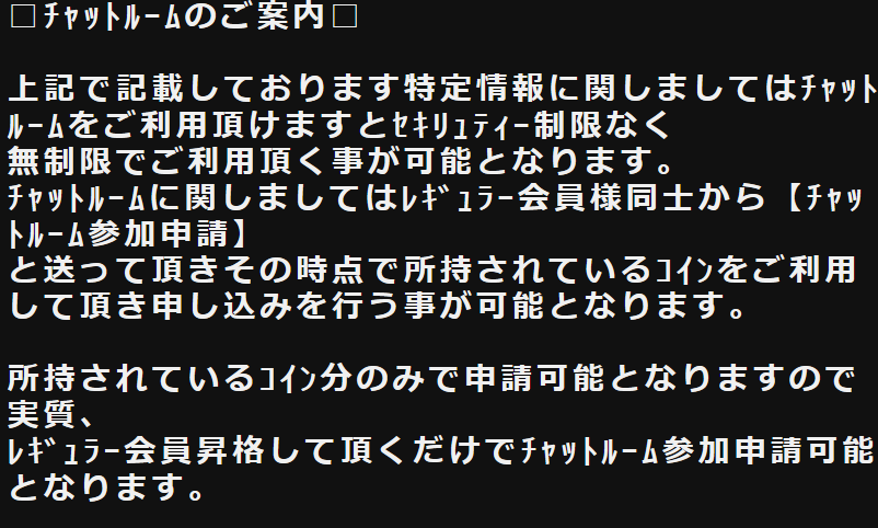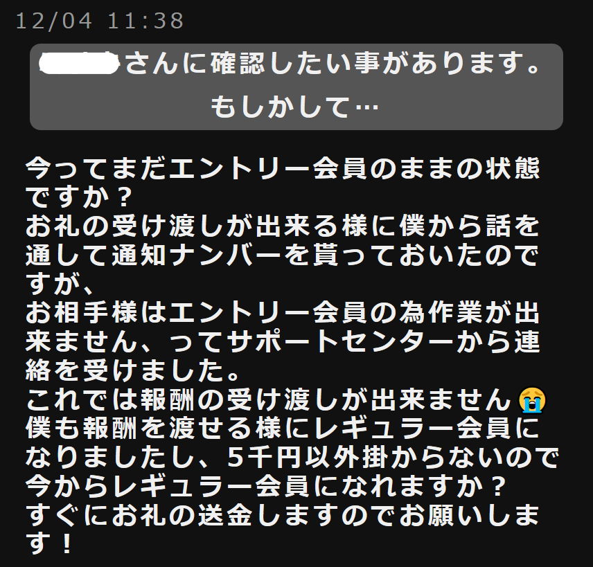 |   連絡先の交換や場所情報などが禁止となっている為にチャットルームを利用すると制限なくやり取りが可能となり、チャットルームを利用できるのは「レギュラー会員」にお互いがならないとダメとなりました。   「5000円」払わないとレギュラー会員になれずに連絡先の交換もできずに約束の報酬も受け取れないと、報酬金を貰えるはずが5000円払わないとダメになりました。。 おかしな話ですよね。 相手(サクラ)からもこんなことを言ってます↓  すぐにお礼したいから5000円払ってレギュラー会員になってよ~ときます! ※絶対に払わないでください!レギュラー会員になっても約束の報酬は受け取れません! |