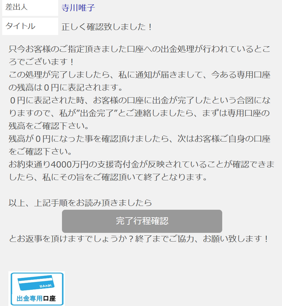 - 大金を餌に手続き費用の名目で金銭を要求している