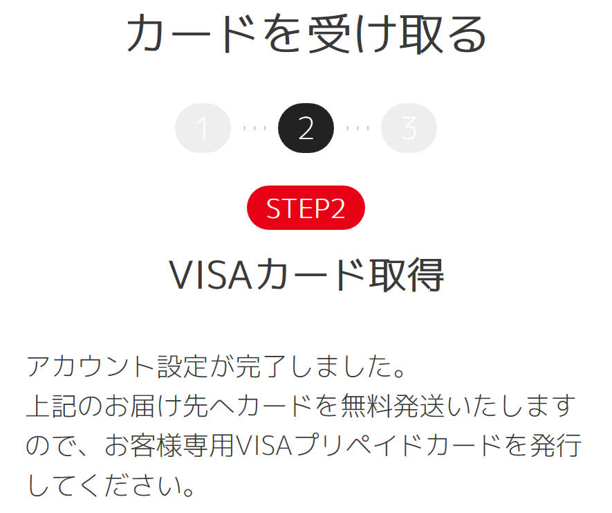 名前・住所を送るとSTEP2「カードを受け取る為にカードを発行してください」ときます。