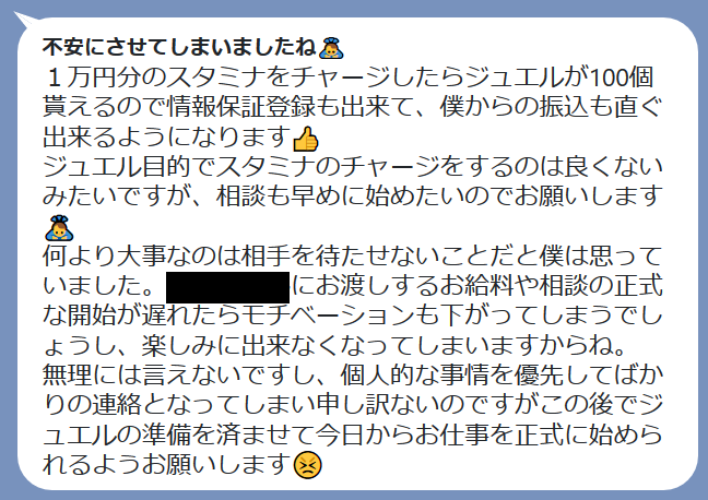 泣く泣く要求通りの1万円でスタミナ購入しジュエルを獲得しましたが、さらに「300個のジュエルが必要」となり3万円を要求されます。