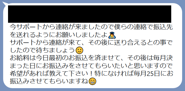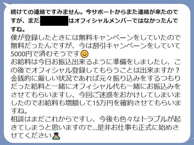 振込されると思わせて、「オフィシャルメンバー」にならないとダメとなり、メンバー登録には5000円が必要となります。給料も15万円に増えメンバー登録費も上乗せして入金すると畳掛けてきます。