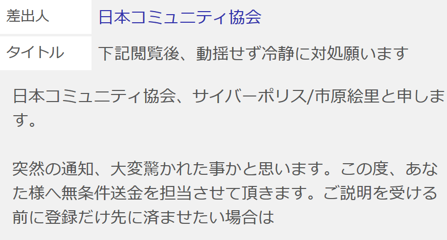 差出人:日本コミュニティ協会 突然の通知、大変驚かれた事かと思います。この度、あなた様へ無条件送金を担当させて頂きます。 こちらよりお名前の登録をお済ませ下さい。 それではご説明させて頂きます。 ■━…━…━…━■ ■━…━…━…━■ さらに調査対象になったあなた様を含め他多数名様の利用実績をお調べ致しましたところ、過去の利用実績から送金実績があって然るべきです。 幸い、運営側にも同様に問題視している幹部の方達がおり、この度【無条件送金】が認可されました!!あなた様は日本コミュニティ協会、サイバーポリスより無条件送金を受けることが出来ます。 ■━…━…━…━■ ■━…━…━…━■ 今回送金される金額は3億円となっております。 こちらよりお名前の登録をお済ませ下さい。 それでは今後とも何卒宜しくお願いします。 【サイバーポリス/市原絵里】
