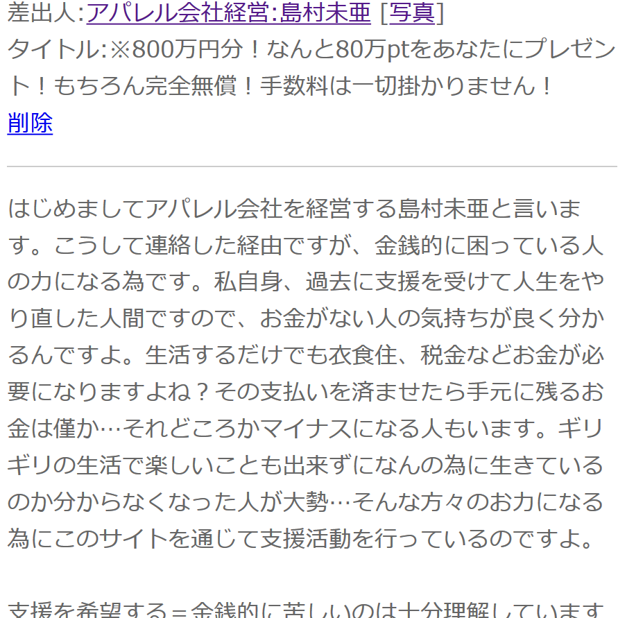 無数にサクラが登場します。(支援金、ポイント譲渡、煽り役、色恋・変態...なんでも) ![]() アパレル会社経営:島村未亜
