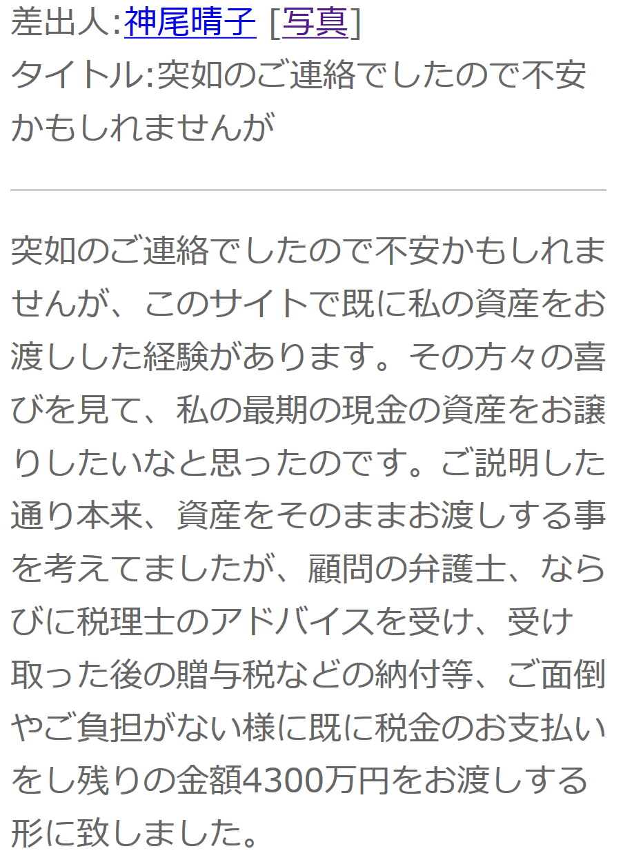 ![]() 「神尾 晴子」という人物から4300万円を受け取ってほしいとメールが送られてきます。