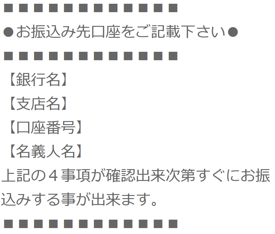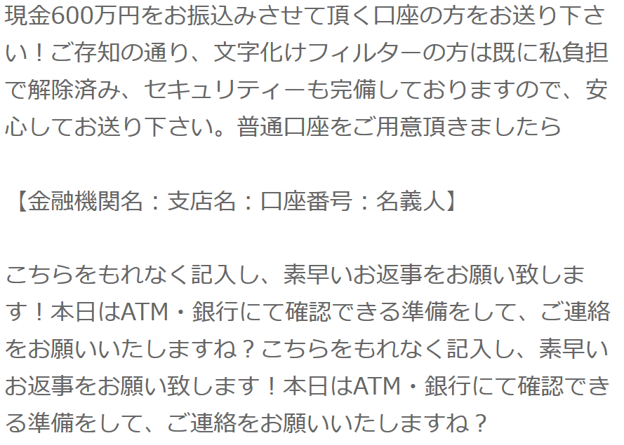 ![]() 口座情報を送ればスムーズに4300万円が送金されると口座情報を聞いてきます。