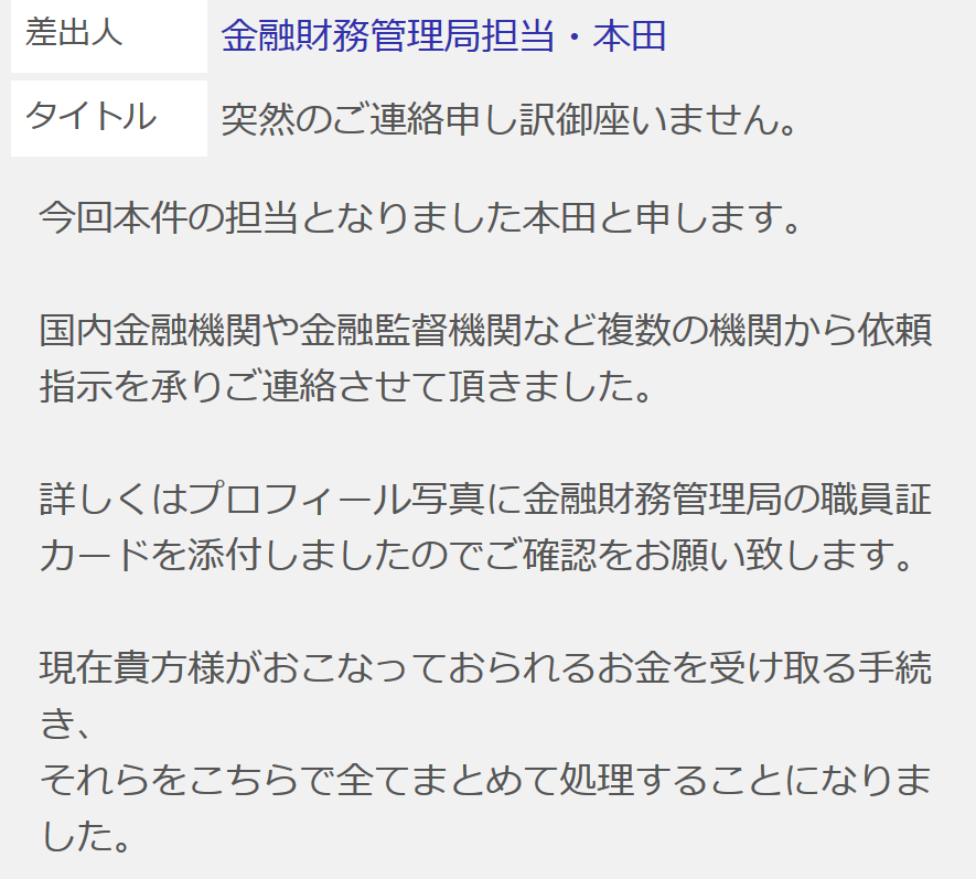 - 大金を餌に手続き費用の名目で金銭を要求している