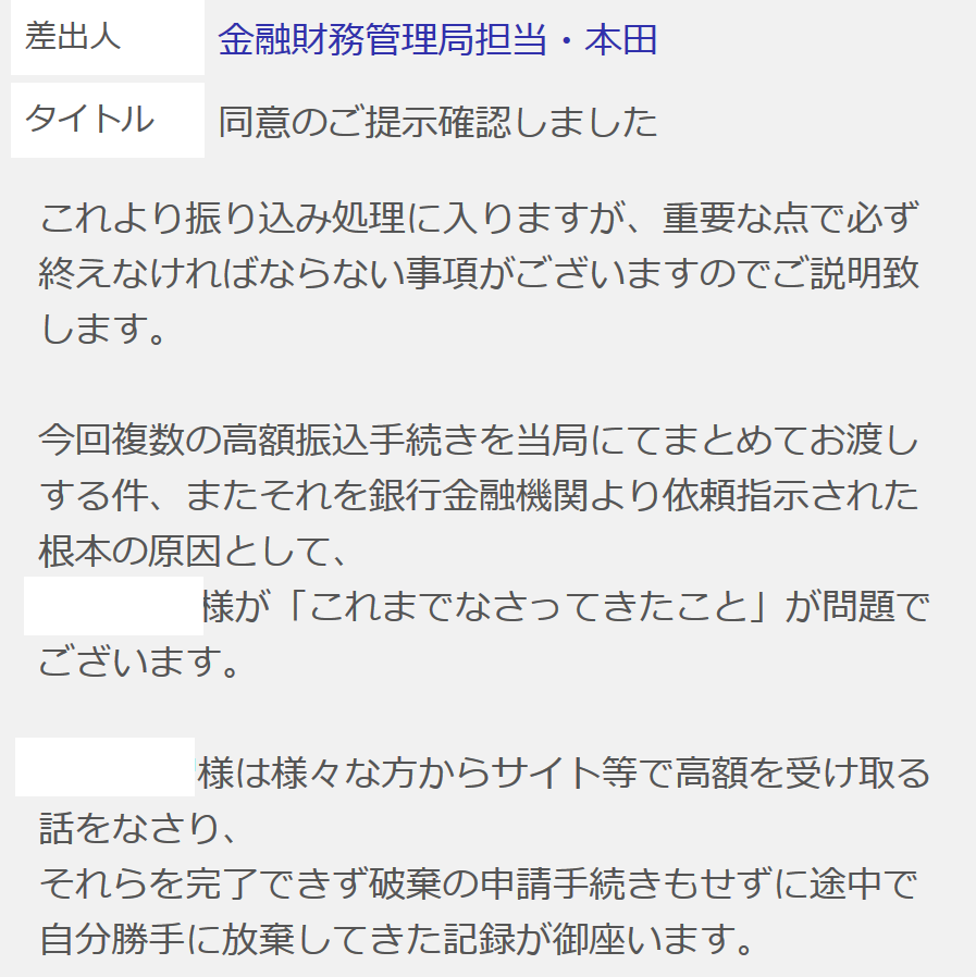「5000万円送金される」から口座情報を送れとの指示がされ口座情報を送ると、二度簡単なやり取りをされます。