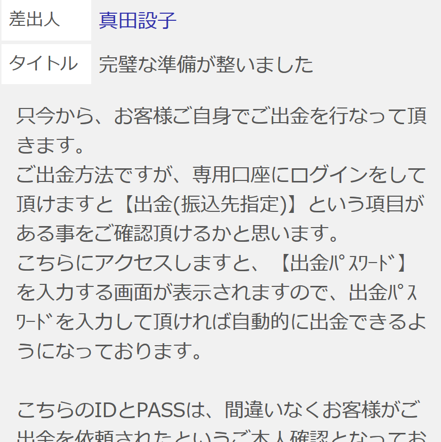 こちらのIDとPASSは、間違いなくお客様がご出金を依頼されたというご本人確認となっておりまして【出金パスワード発行料金:3000円】をお預かりさせて頂きます事を予めご了承下さいませ。