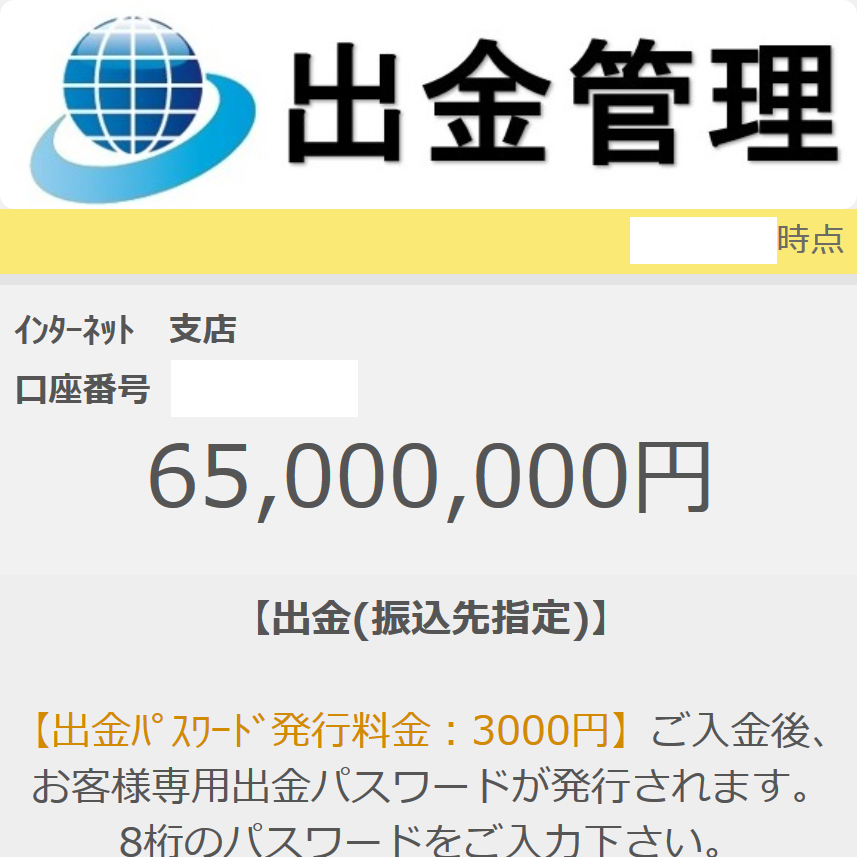 出金専用口座に支援寄付金が支援者から振り込まれ「6500万円受け取れる」と誘惑してきますが、【出金パスワード3000円】を要求してきます。