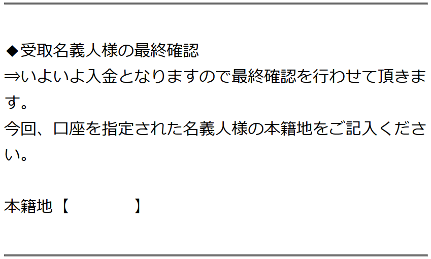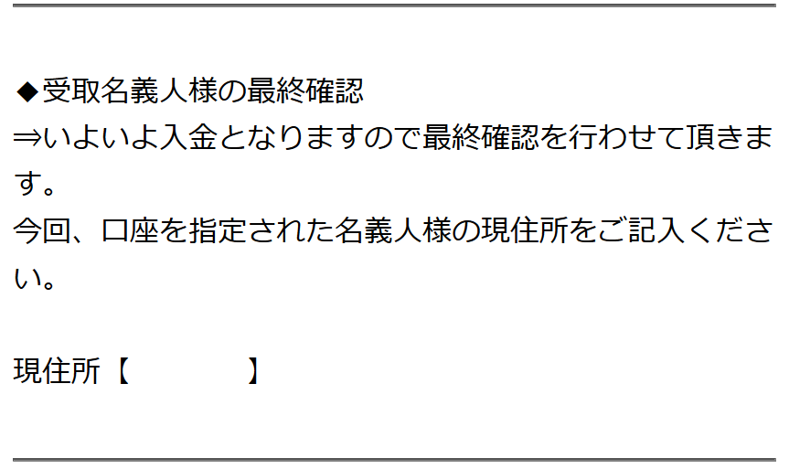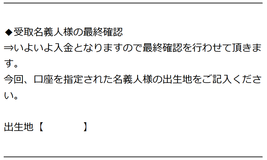 - 大金を餌に手続き費用の名目で金銭を要求している