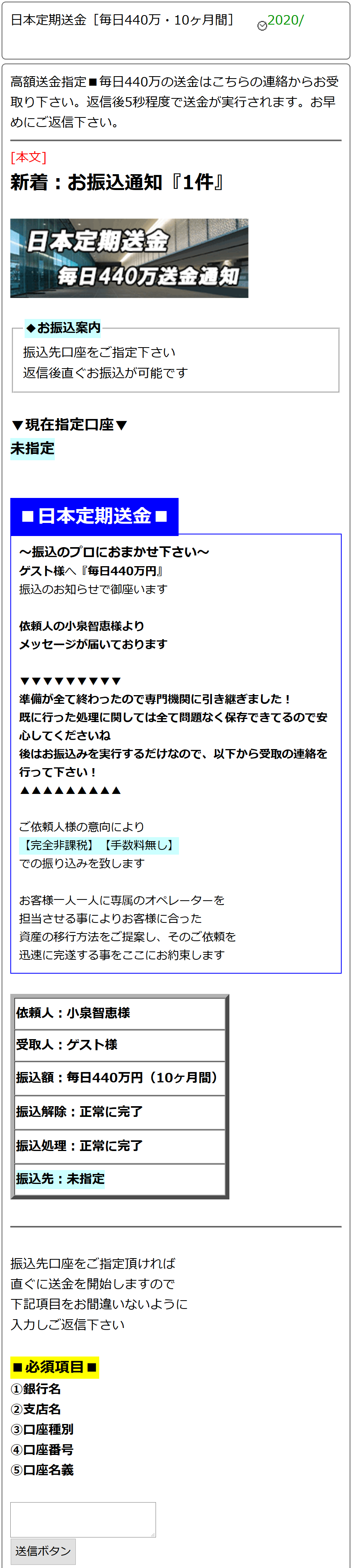 「日本定期送金 毎日440万送金通知」 と迷惑メールを大量に送り付けてきます。 「小泉智恵」から毎日440万円が振込まれるということです。 銀行口座を入力して送信すれば受け取れると誘いこみます。 口座情報を入力してしまうと ↓