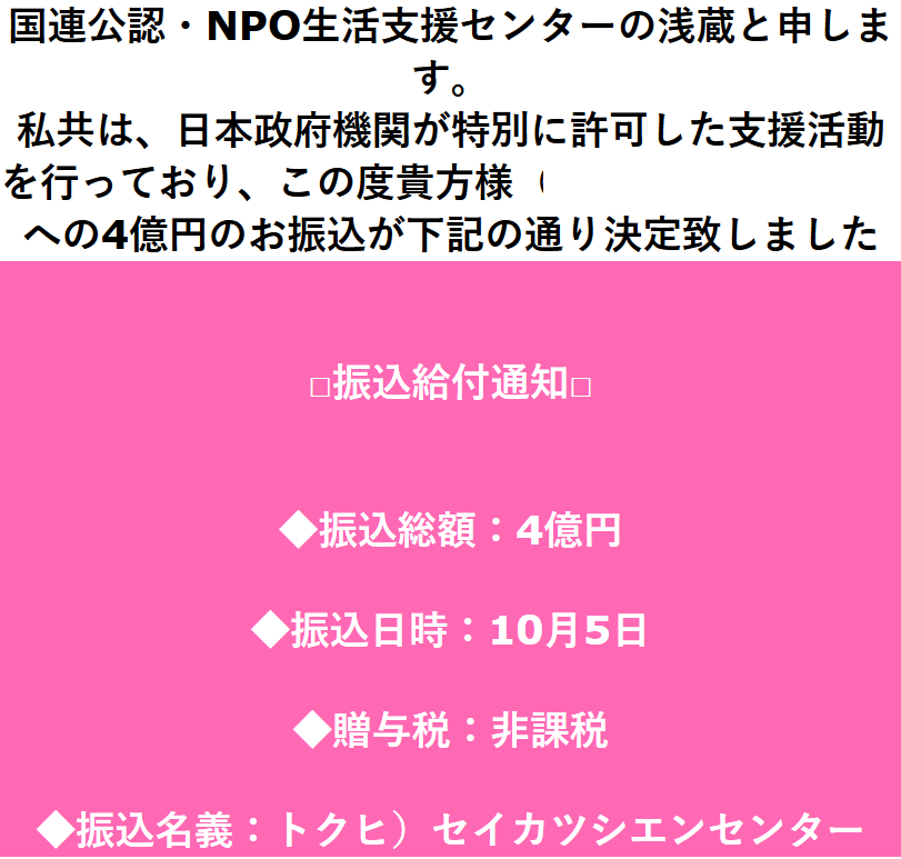 私共は、日本政府機関が特別に許可した支援活動を行っており、この度貴方様(※)への4億円のお振込が下記の通り決定致しました