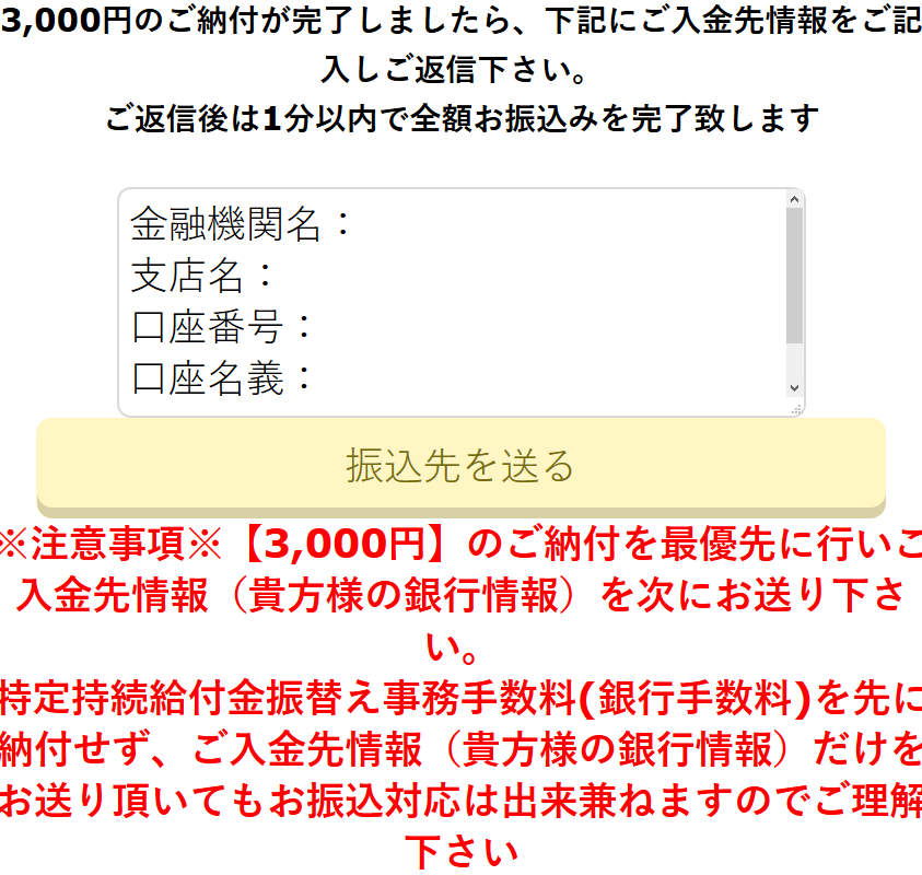 ※【3000円】の入金と口座を送ると受け取れると詐欺ります。