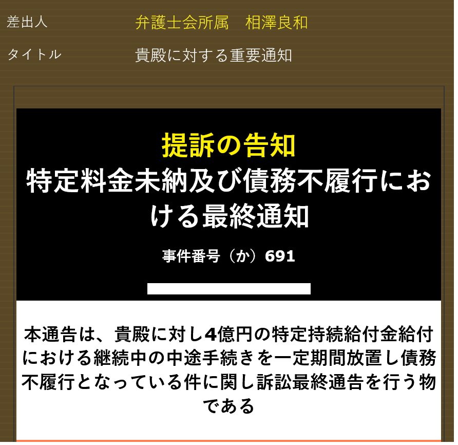 4億円の特定持続給付金給付における継続中の中途手続きを一定期間放置し債務不履行となっている件に関し訴訟最終通告を行う