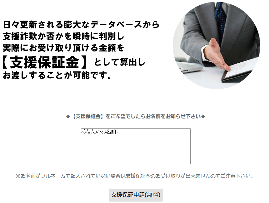 - 支援金を受け取れた人がいない(サイト内で受け取れたと登場する人物は煽り役)