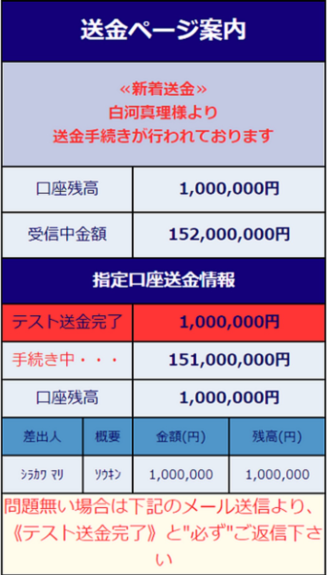 「まず512万円入金したと信用させ、1億4800万円支援金を餌にぶら下げ、手続き費用を騙し取る」