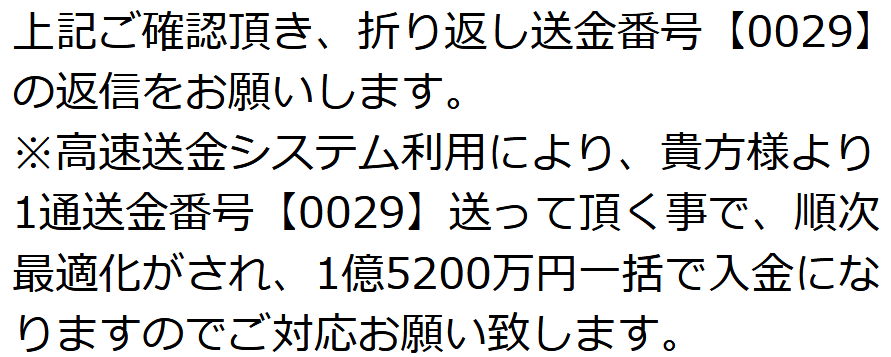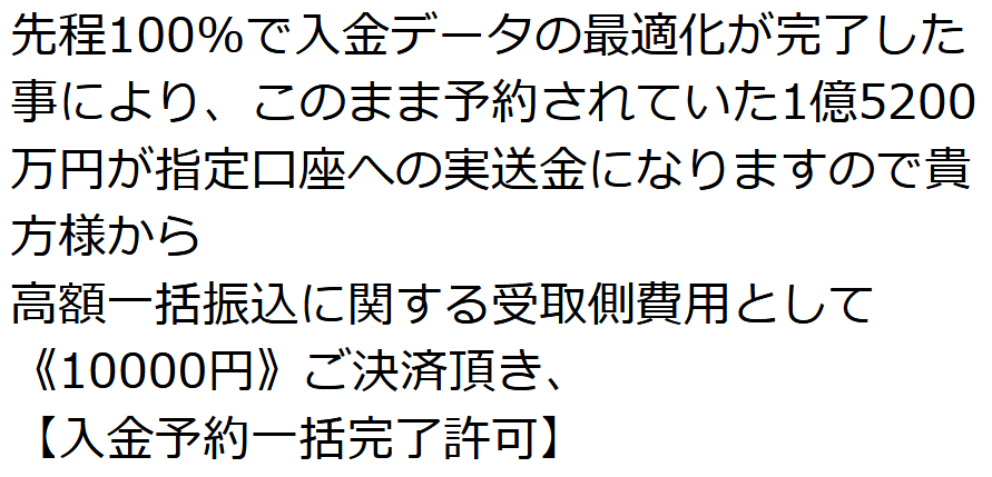 ※何かよくわかりませんが、データ摘出がどうたらで、英数字を何度か送らされ、100%になったから送金されるが、受取費用として10000円が必要となります。