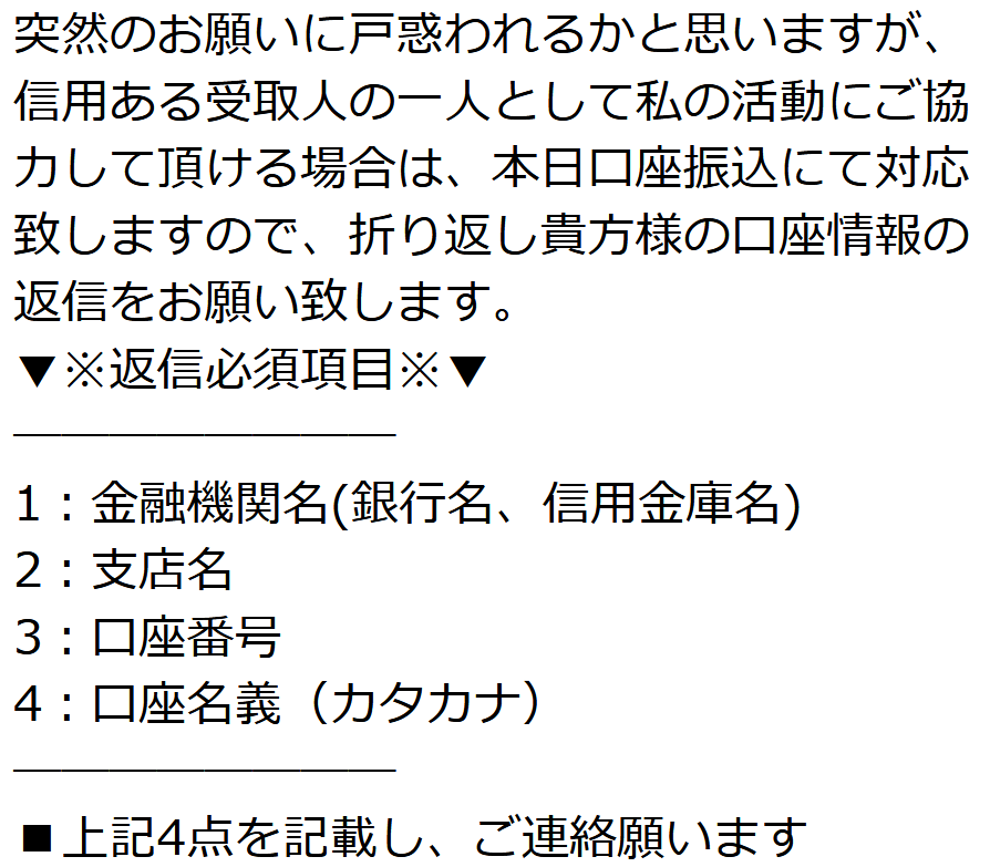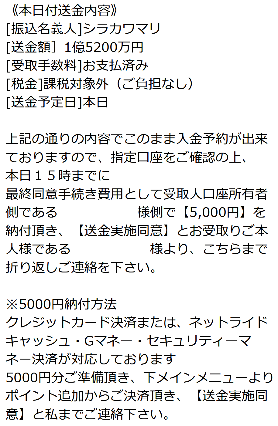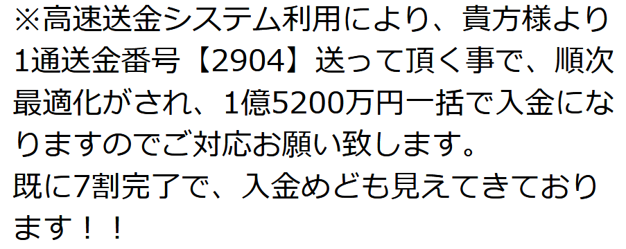 • 大金を餌に手続き費用の名目で金銭を要求している