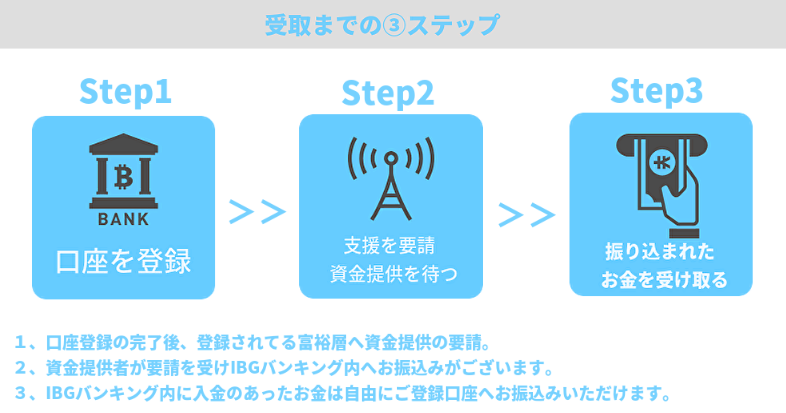 「確認完了し『IBGバンキング』が自由に使えると同時に資金提供要請が行われ、すぐに富裕層からの資金提供がされ反映されます」