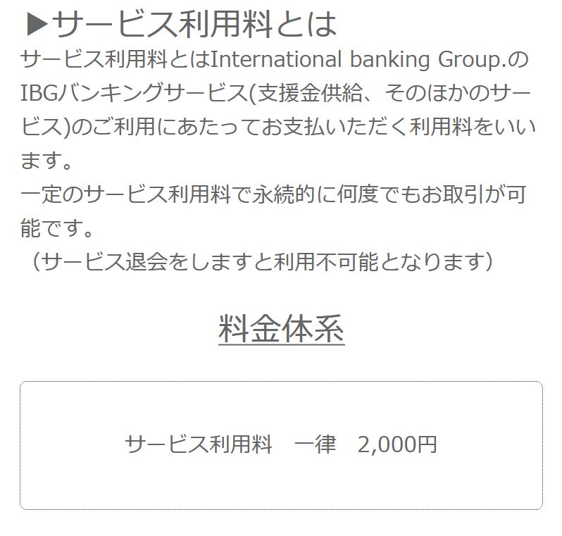 サービス利用料とはInternational banking Group.のIBGバンキングサービス(支援金供給、そのほかのサービス)のご利用にあたってお支払いただく利用料をいいます。