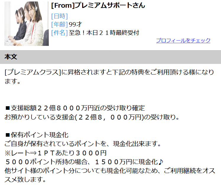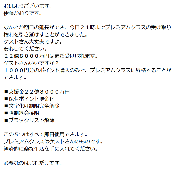SMS(ショートメール)で迷惑メールを大量に発信し誘導して、伊藤かおり(プレミアムクラス・プレミアムサポート)を用いて支援金詐欺・偽会員特典で騙し取る詐欺サイト