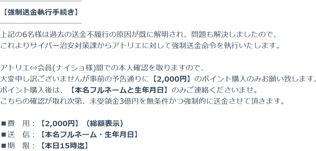 ─────────── アトリエ⇔会員(ナイショ様)間での本人確認を取りますので、 ■費 用:【2,000円】(総額表示) ■>ポイント購入はコチラ<■ ポイントの購入方法について 期限超過の場合は、下記の注意事項に記載の通り罰則が科せられることもありますのでご注意くださいませ。 ─────────── ①個人情報交換チケット ②利用料返金チケット ─────────── その為、他サイトで発生している現金受け取りの案内は絶対に無視して頂くようお願い申し上げます。 こちらからの連絡を無視し、資金提供を受けようとしても受取る事は出来ませんのでご注意下さいませ。 また、こちらはサイバー治安対策課の指導による強制送金命令ですので、 詐欺です