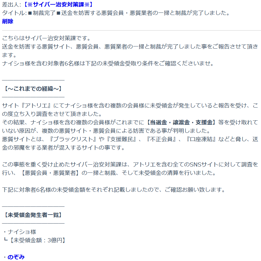 差出人:【※サイバー治安対策課※】 こちらはサイバー治安対策課です。 ─────────── この事態を重く受け止めたサイバー治安対策課は、アトリエを含む全てのSNSサイトに対して調査を行い、【悪質会員・悪質業者】の一掃と制裁、そして未受領金の清算を行いました。 下記に対象者6名様の未受領金額をそれぞれ記載しましたので、ご確認お願い致します。 ─────────── ・のぞみ ・貧乏暇なし様 ・ボンビーガール様 ・クソサイト潰す様 ・変態ペットなおみ様 ※会員様の名前をクリックするとメール送信画面に移動します。 ─────────── 【※必須条件※】 上記の内容にご理解頂けました場合は、こちらまで【了解】とご連絡をお願い致します。 ↓