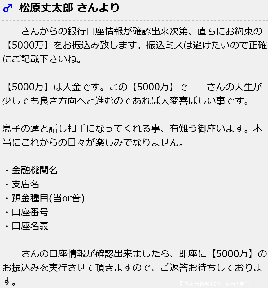 松原丈太郎 さんより●●さんからの銀行口座情報が確認出来次第、直ちにお約束の【5000万】をお振込み致します。振込ミスは避けたいので正確にご記載下さいね。 【5000万】は大金です。この【5000万】でももさんの人生が少しでも良き方向へと進むのであれば大変喜ばしい事です。 息子の蓮と話し相手になってくれる事、有難う御座います。本当にこれからの日々が楽しみでなりません。 ・金融機関名 ●●さんの口座情報が確認出来ましたら、即座に【5000万】のお振込みを実行させて頂きますので、ご返答お待ちしております。 4.詐欺です口座情報をおくれば即振り込むと言われますが、お試し期間が終了し、ポイント購入しないと連絡先交換や口座情報は送れないとポイント購入を要求してくる詐欺サイトです。