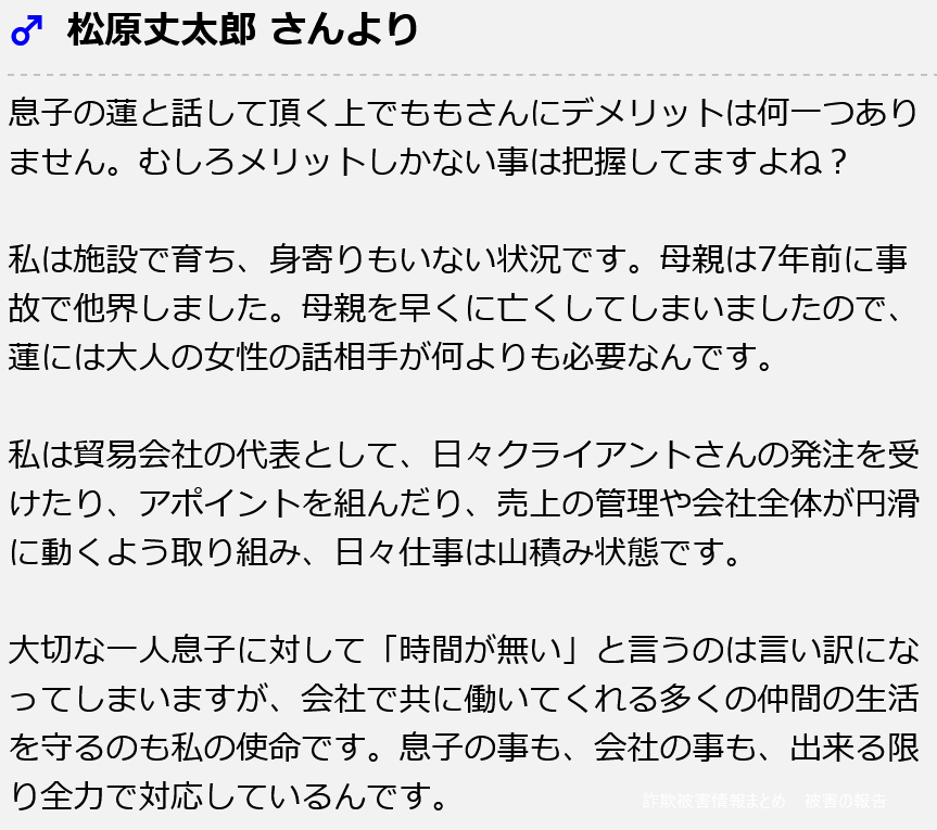 松原丈太郎 さんより息子の蓮と話して頂く上でももさんにデメリットは何一つありません。むしろメリットしかない事は把握してますよね? 私は施設で育ち、身寄りもいない状況です。母親は7年前に事故で他界しました。母親を早くに亡くしてしまいましたので、蓮には大人の女性の話相手が何よりも必要なんです。 私は貿易会社の代表として、日々クライアントさんの発注を受けたり、アポイントを組んだり、売上の管理や会社全体が円滑に動くよう取り組み、日々仕事は山積み状態です。 大切な一人息子に対して「時間が無い」と言うのは言い訳になってしまいますが、会社で共に働いてくれる多くの仲間の生活を守るのも私の使命です。息子の事も、会社の事も、出来る限り全力で対応しているんです。 ただ、どうしても自分一人では補えない部分があります。息子の傍にずっと居続ける事は正直不可能な事なんです。だからももさんに助けを求めました。息子の話相手になってもらい、少しでも息子の支えになって欲しいと。 もちろん私からの身勝手なお願いですし、大切な一人息子の為ですから、謝礼としては【5000万】ほどはご用意させて頂いてます。会社経営者として十分な資産はありますし、息子の為に協力して頂けるなら、これ位の額は当然だと考えています。 今回、ももさんにご連絡した最大の理由は、息子の蓮が「この人とお話したい」と選んだからです。息子が選んだ相手を心底信じたいと思い、勇気を出してご連絡したんです。 後々、息子の蓮の方からもご連絡差し上げたいと思っておりますが、問題が無ければご返答頂けますでしょうか?お待ちしております。 これに返信をすると、息子の『連』からメールがきます。