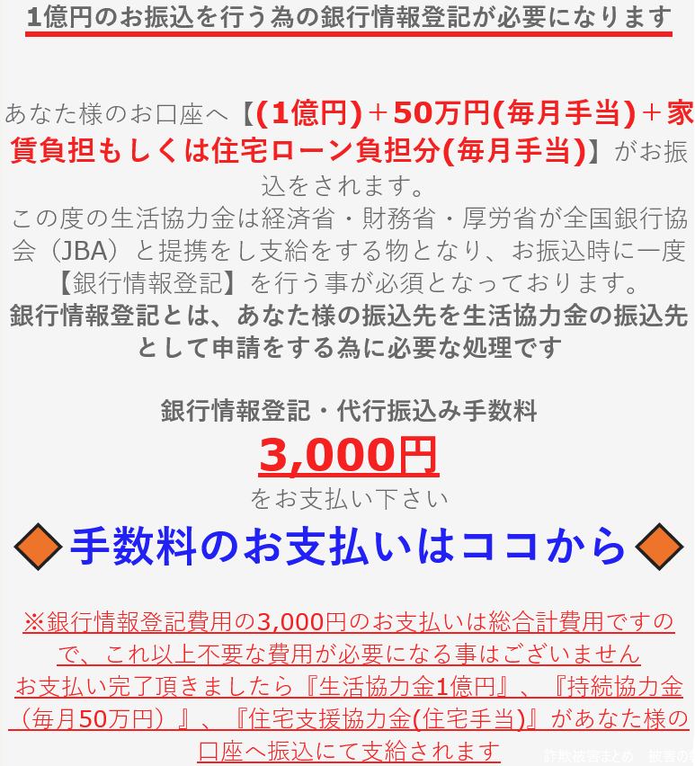 「あなた様のお口座へ【(1億円)+50万円(毎月手当)+家賃負担もしくは住宅ローン負担分(毎月手当)】がお振込をされます。」