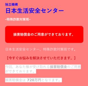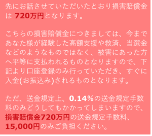 口座情報を送るだけで、損害賠償金720万円が受け取れると、口座情報を送ると「送金規定手数料1万5000円のみを支払え」と要求してきます↓