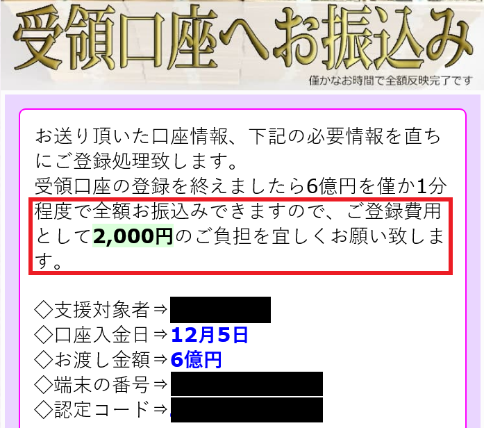 当初は無償で6億円が受け取れますと誘い込んでますが、口座情報送ると「ご登録費用として2000円」の費用を要求してきます!