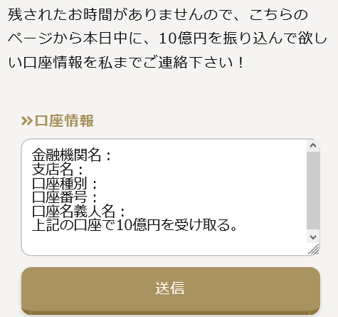 大金を支援すると言って、口座情報を送るように指示しますが、送るにはポイント購入が必要になるという「大金を餌にお金を騙し取る」利益誘引型詐欺です。 煽り役(他受取2名)など登場させて、「手続きを一緒に頑張ろう」などと揺さぶってきます。もちろんこれも詐欺の演出です。